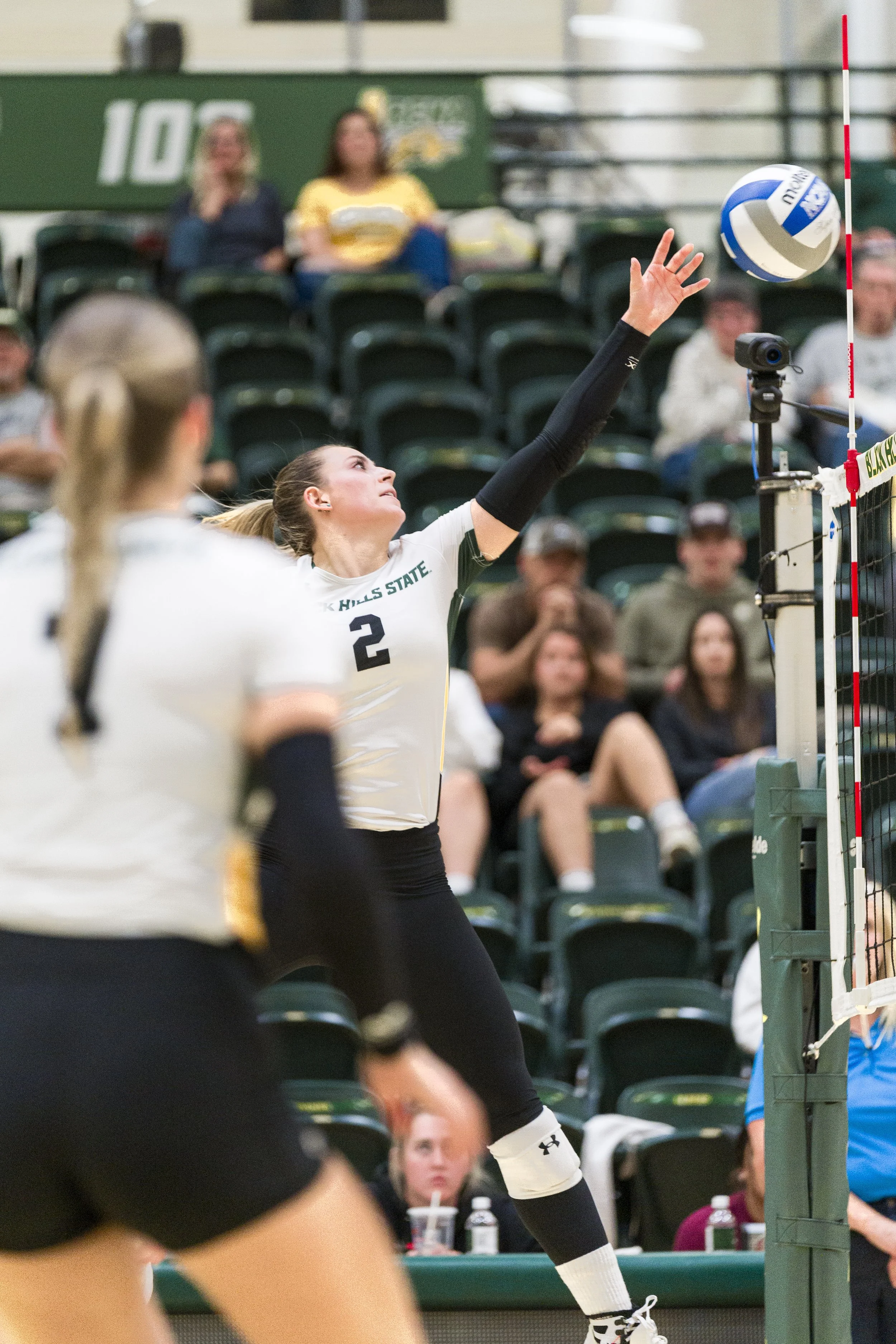 A female volleyball player reaching to hit or block the ball during a match at college or university gymnasium, with spectators seated in the background.