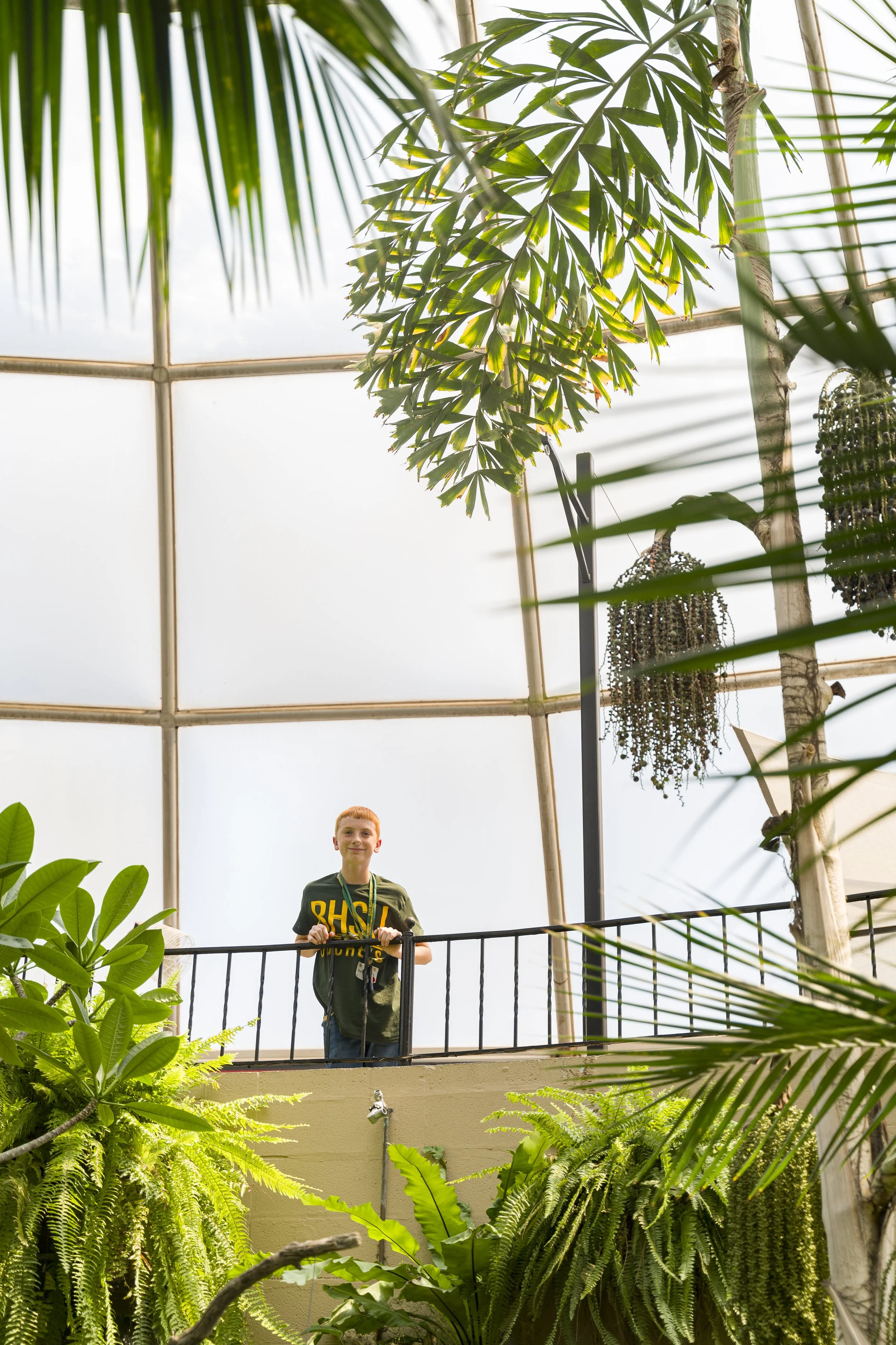 A young boy stands on an indoor balcony surrounded by lush green tropical plants, with a translucent glass ceiling overhead creating a bright, natural light-filled atmosphere.