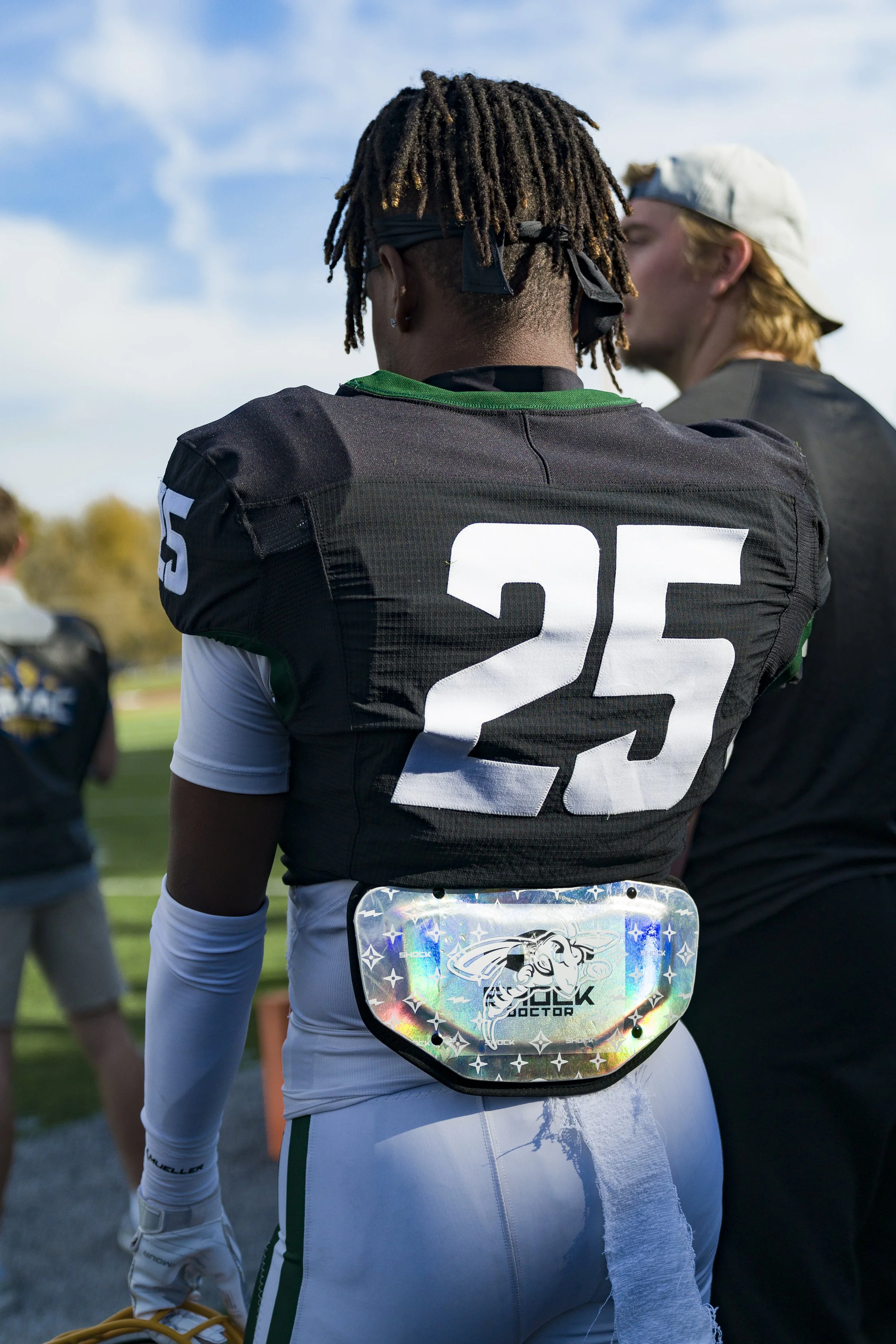 A football player wearing a black jersey with the number 25 on the back, standing outdoors on a football field with a clear sky, with other people in the background. View fullsize