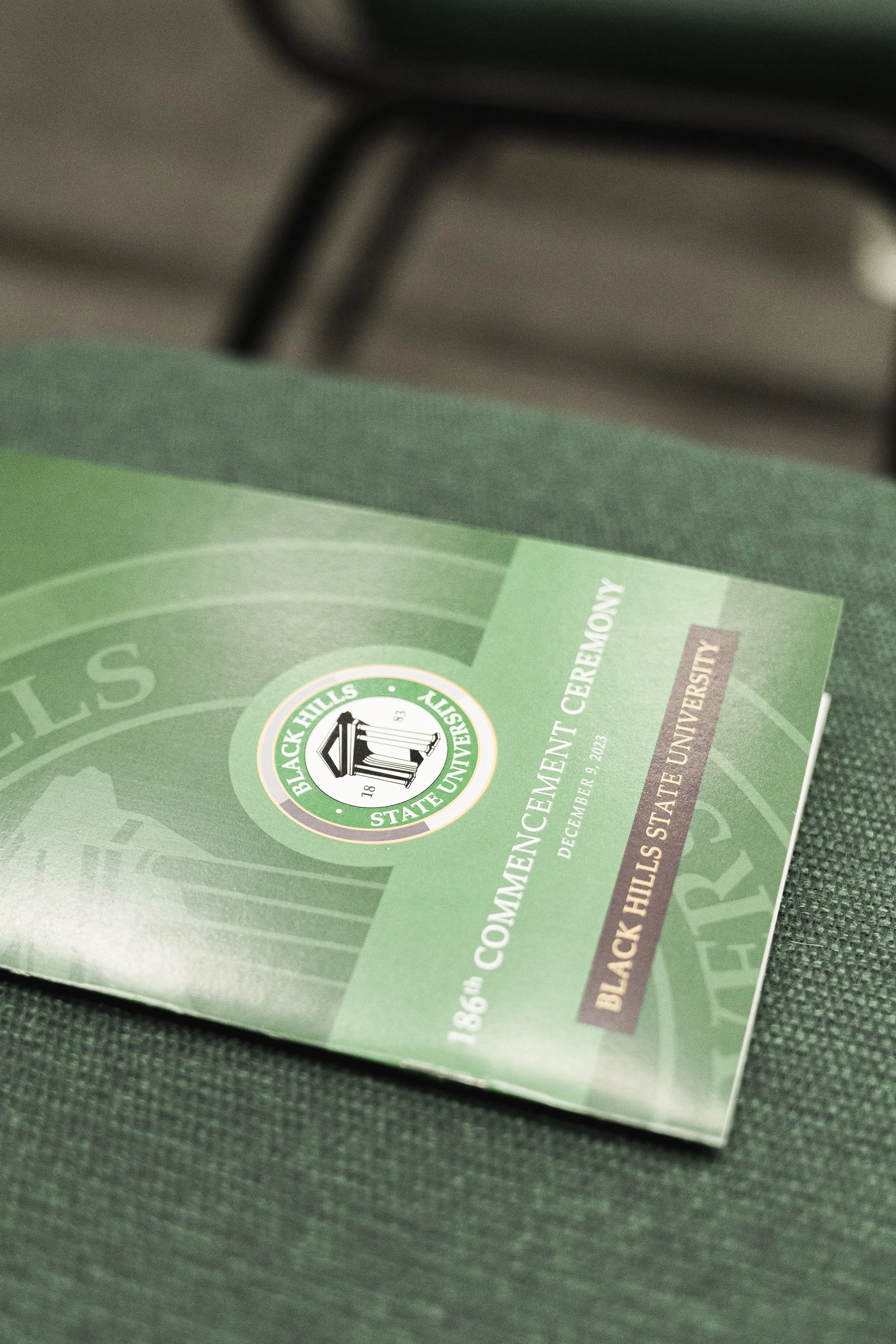 Invitation card for the 136th Commencement Ceremony of Black Hills State University resting on a green fabric surface.