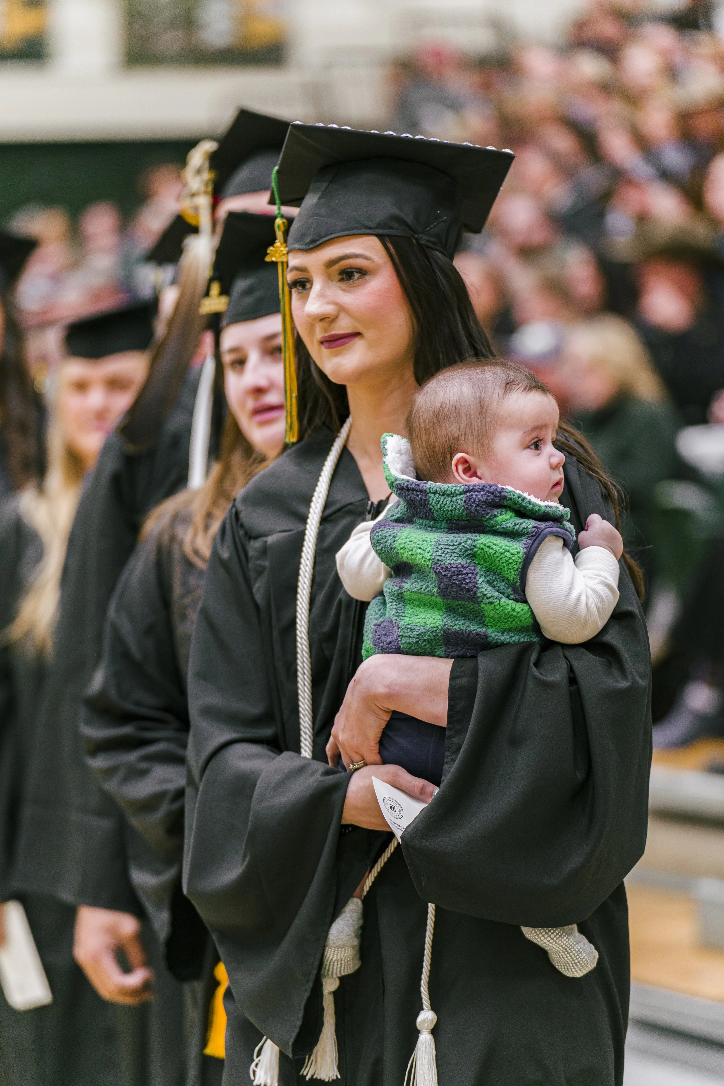 A woman in a graduation cap and gown holding a young child at a graduation ceremony, with other graduates in caps and gowns in the background.