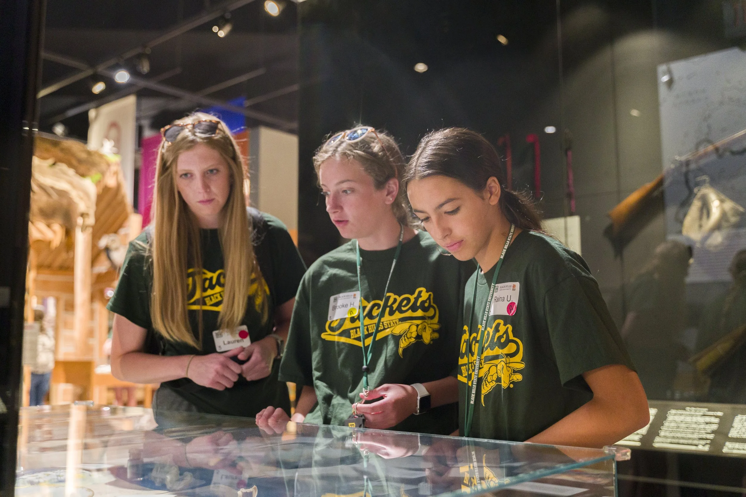 Three young women wearing matching green t-shirts with yellow text, looking at an exhibit inside a museum or display case, with one woman holding a smartphone and the others observing curiously. View fullsize