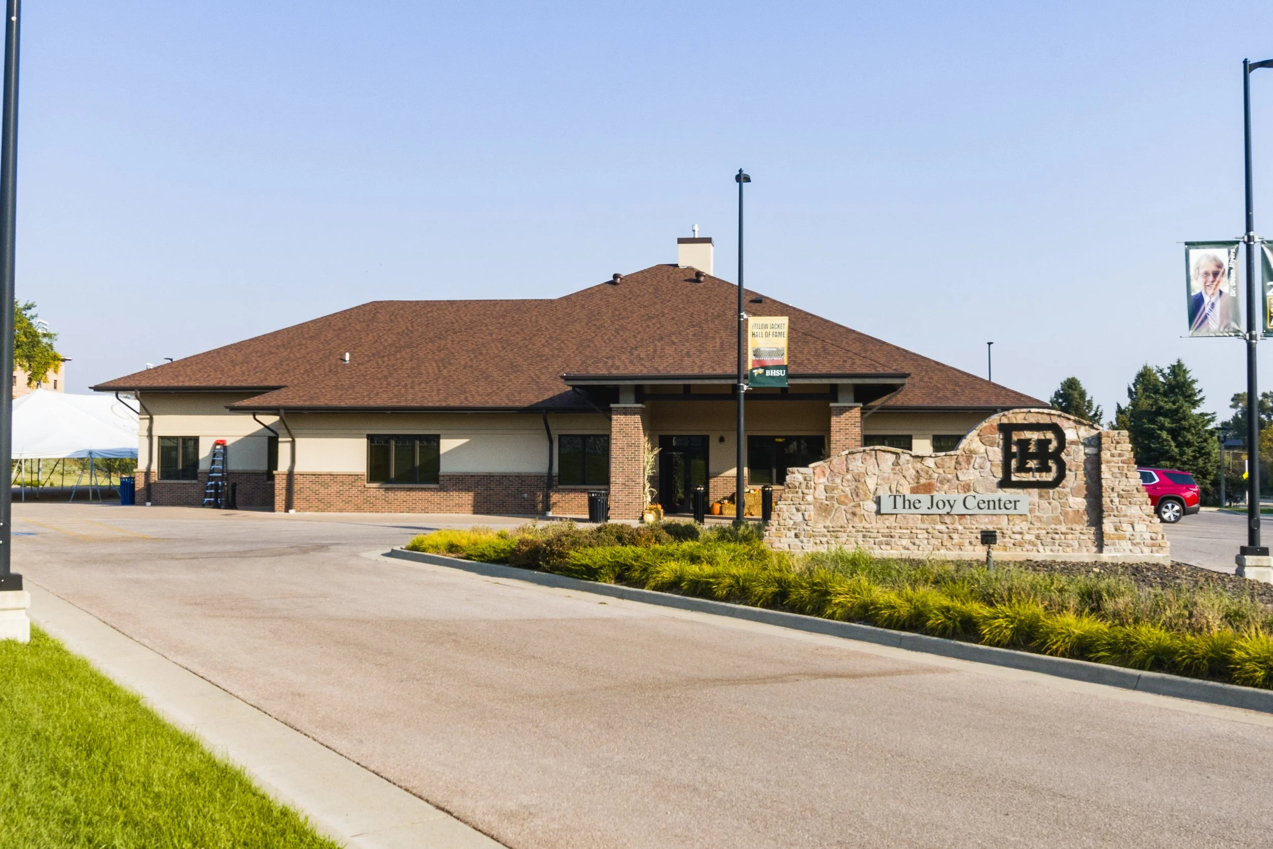 The Joy Center building with a brick and white exterior, a brown shingled roof, and a stone sign with the words "The Joy Center" and a logo, surrounded by a landscaped area with green plants. There are banners and a parking lot in front. View fullsize