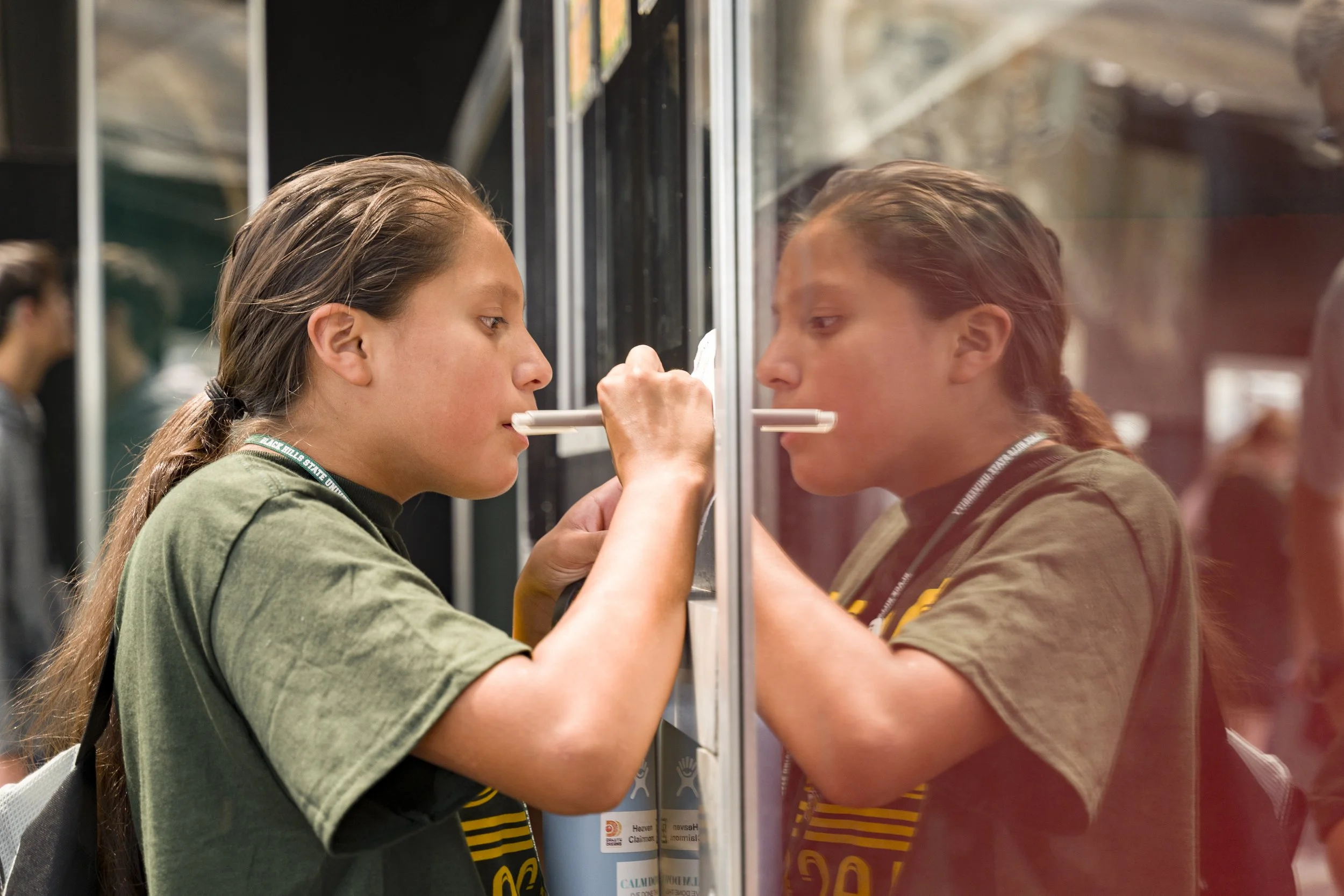 A young girl tests her reflected image by holding a flashlight to her mouth against a mirror in a public space.
