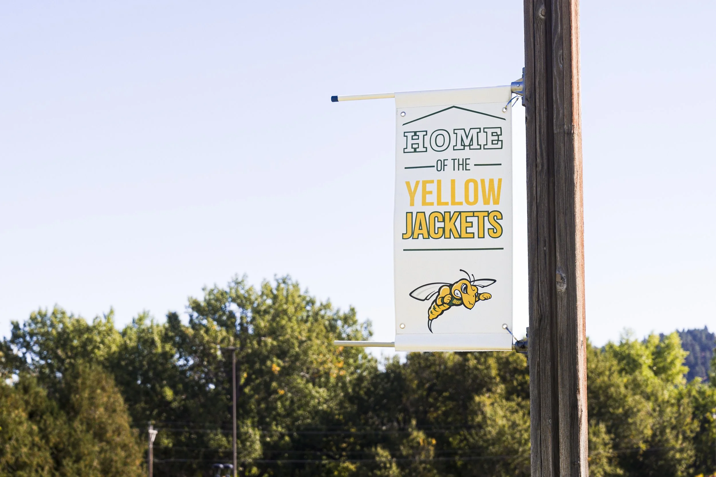 A vertical sign on a wooden pole that reads "Home of the Yellow Jackets" with a yellow jacket mascot illustration at the bottom, set against trees and a clear blue sky.