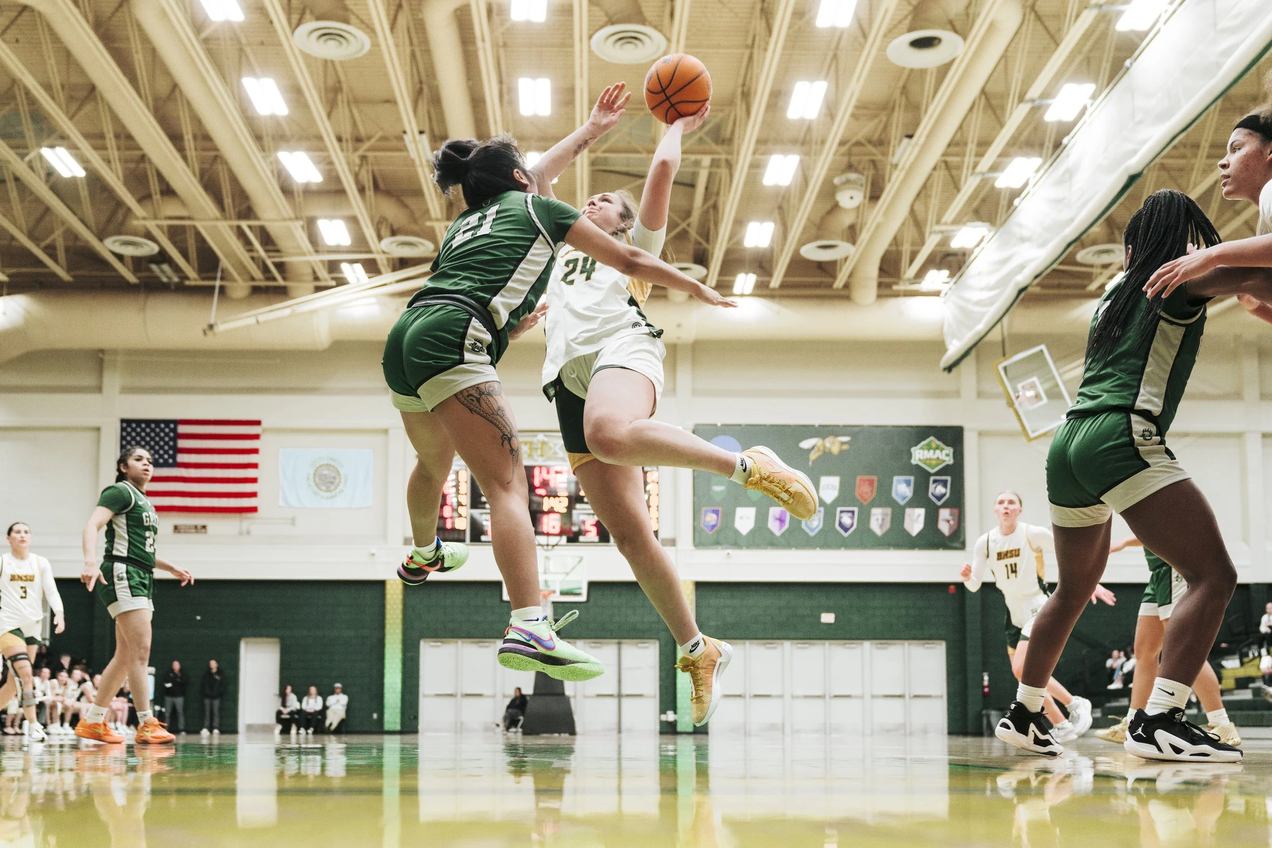 Women’s basketball game with players jumping for ball in gymnasium View fullsize