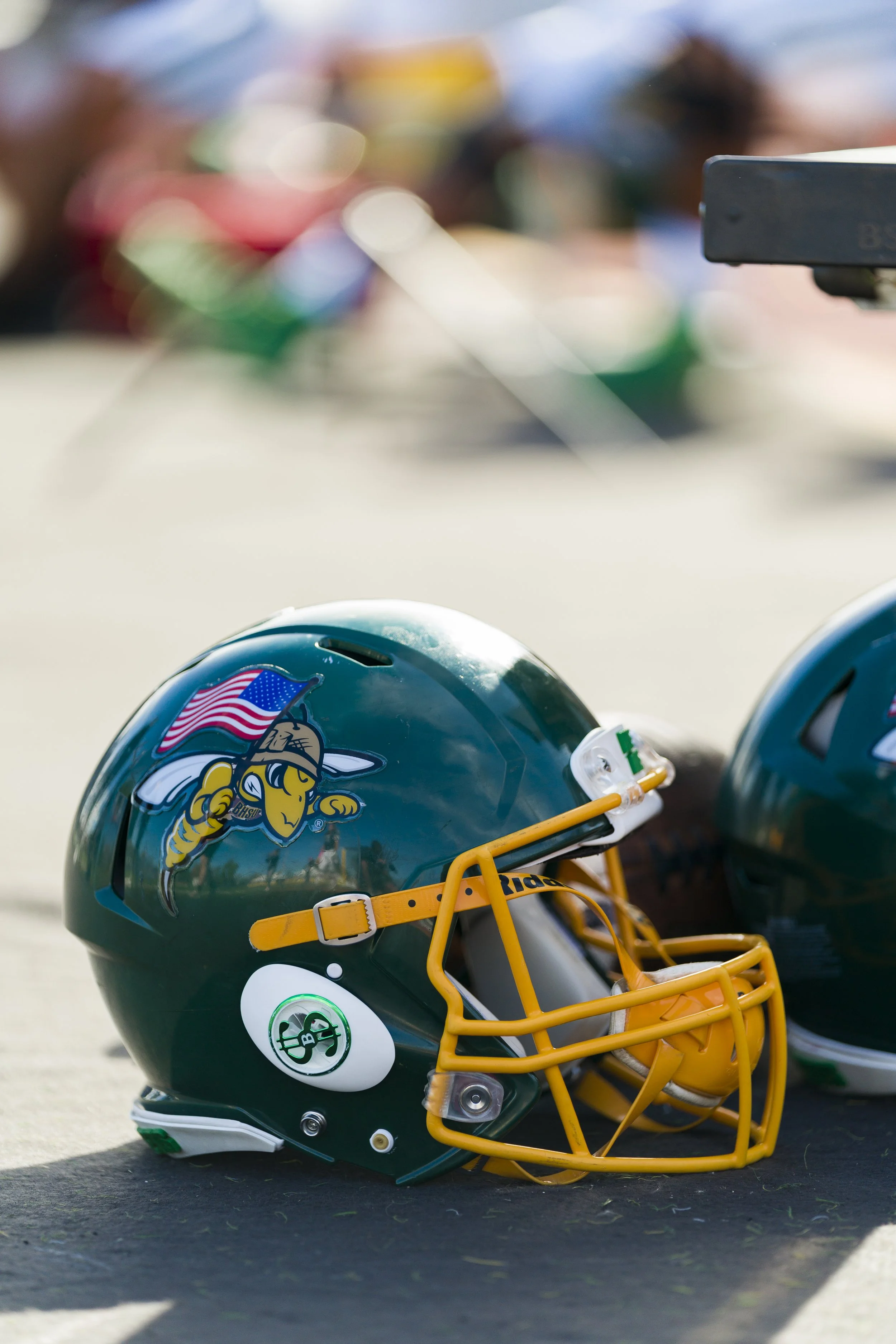Green football helmet with yellow face mask, featuring a logo of a friendly bee wearing a helmet with an American flag, resting on a concrete surface. View fullsize